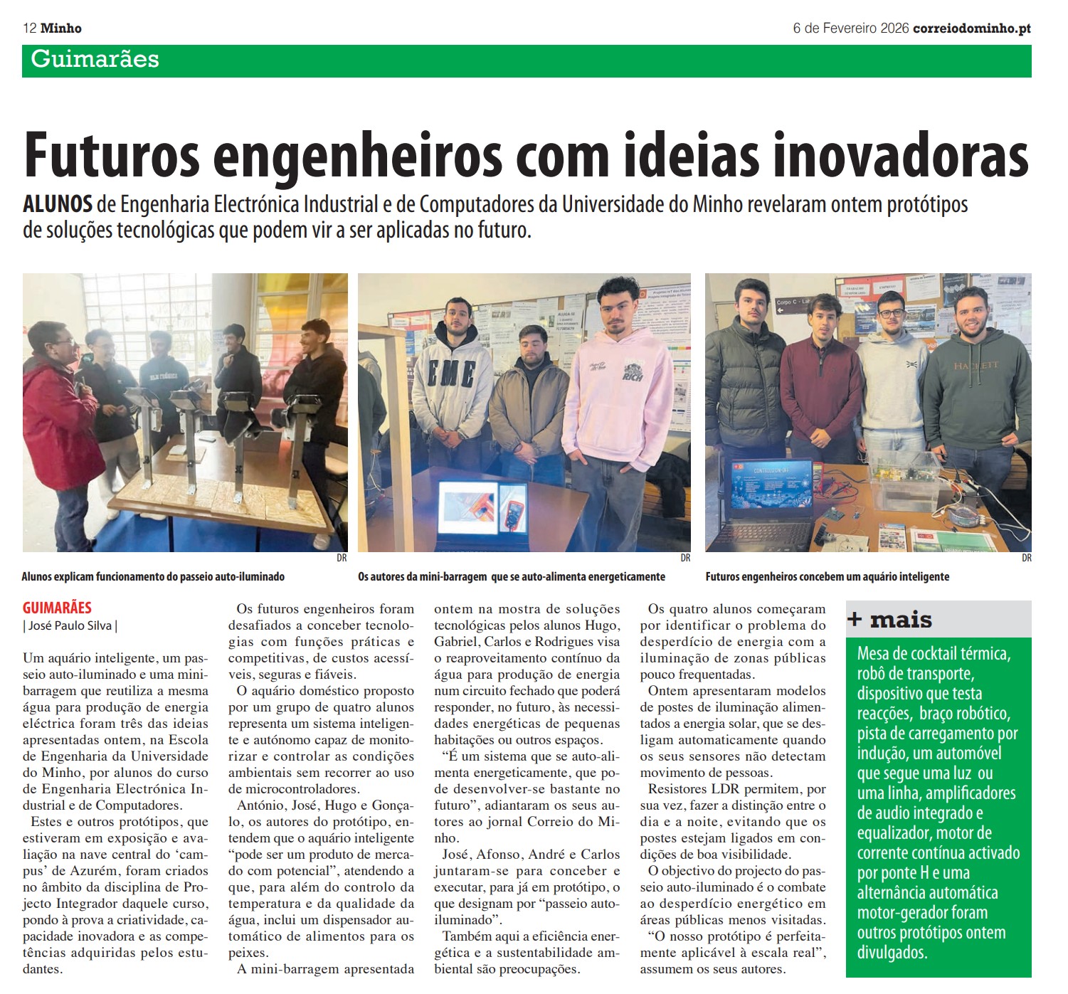 A smart aquarium, a heated cocktail table, a self-illuminating walkway and a transport robot are among the 14 prototypes that 50 students from the School of Engineering at the University of Minho (EEUM) presented to the public on 5 February at the Azurém campus in Guimarães.